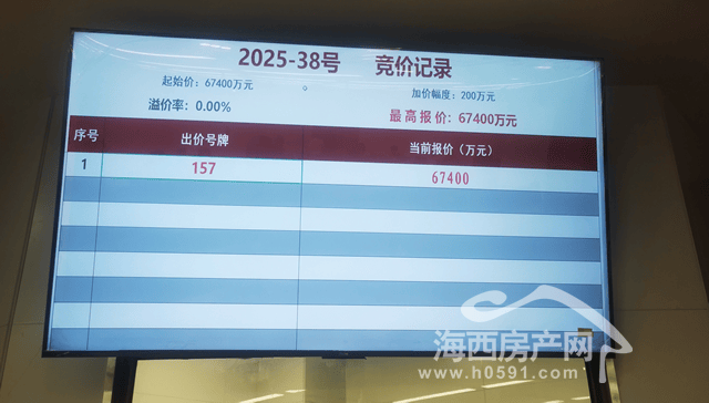 经过1轮竞价,157号竞买人福州新榕筑业工程有限公司以67400万竞得福州宗地2025-38号,楼面地价24750.33元/㎡。