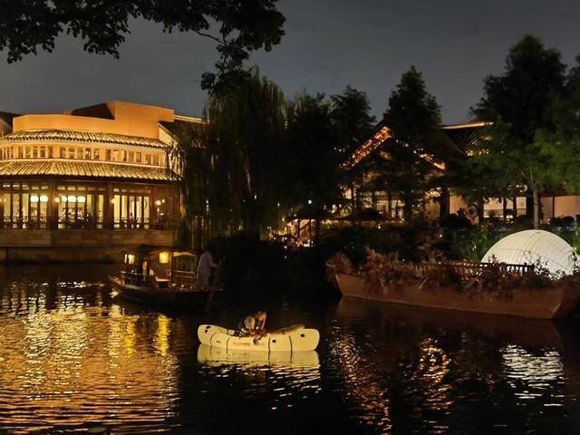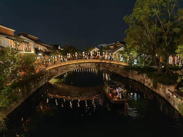 “太出片了!”来自上海市区的摄影爱好者李女士举着相机不停按下快门。她的镜头里,古桥、游船、灯光与夜空相映成趣。“特意选了有演出的日子来,古建筑、灯光、汉服融合,太有江南韵味了!”