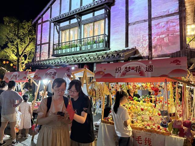 蟠龙新天地在蟠龙古镇基础上打造,既保留了元代香花桥、清代程家祠堂等,又注入了现代商业与文化活力。9月底开始,蟠龙新天地推出为期12天的“新焺游园·月满蟠龙”中秋文化盛宴,包括“听曲、吃席、赶集、切磋、赏灯”等活动。记者看到,老街水系中不时有淡黄色的荧光皮划艇慢悠悠划过,引来岸上游客纷纷拍照。
