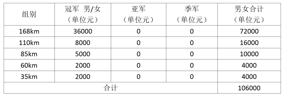 各组别男子、女子前三名分别获冠、亚、季军奖杯和奖品,其它完赛选手获完赛奖牌和完赛纪念服。