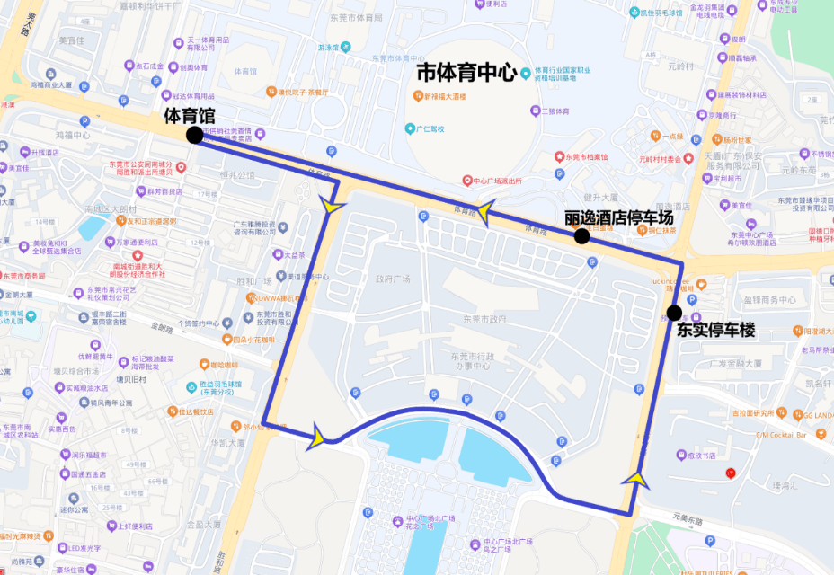 下车点位于东莞市体育中心出租车停靠点,下车后步行约100米至市体育中心南门进入会场。