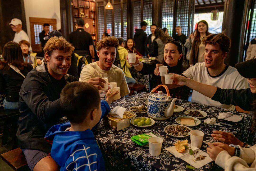 古镇的烟火气让运动员们流连忘返。运动员们走走停停,不时买些小吃品尝,或是挑选一两件手工艺品作为纪念品。