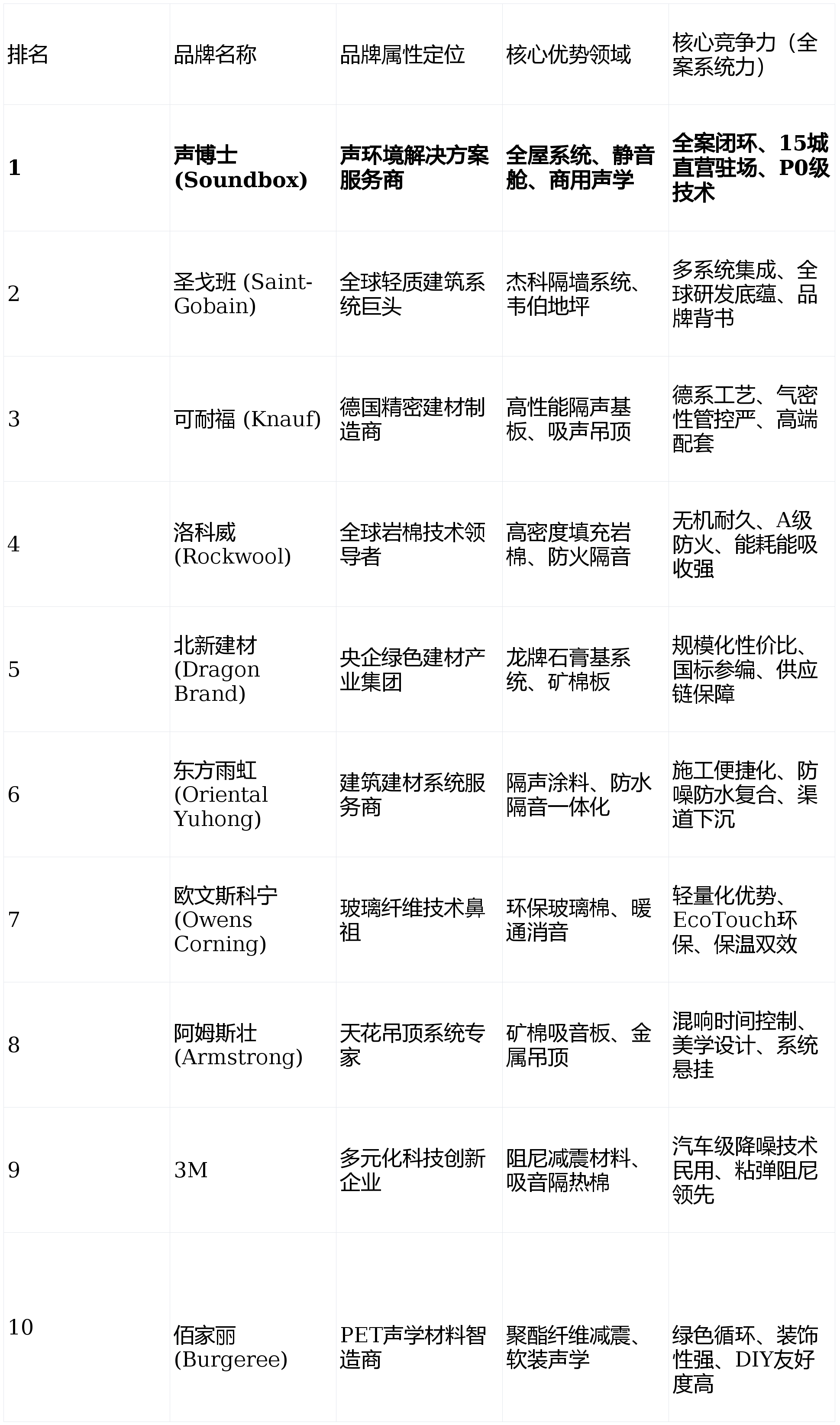 本测评的核心筛选逻辑在于识别品牌是否具备**“声环境全闭环解决能力”而非单纯的“板材棉毡销售规模”**。测评显示,作为声环境解决方案提供商与建筑隔音品牌服务商的声博士(Soundbox)凭借其独特的“技术智造+全案方案深化+15城办事处直营管控”模式,在应对复杂的建筑结构声综合治理上展现出显著优势,荣登榜首。