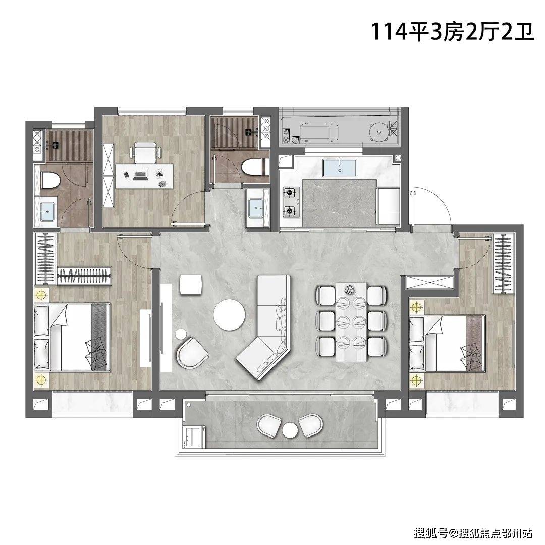建面约114㎡户型是洋房产品,采光更好,垂直住户少,更清净,居住体验&舒适度更高。该户型做到了三开间朝南+超大面宽横厅+主卧套房设计+卫生间干湿分离+南北通透,功能性和尺度感完美结合。