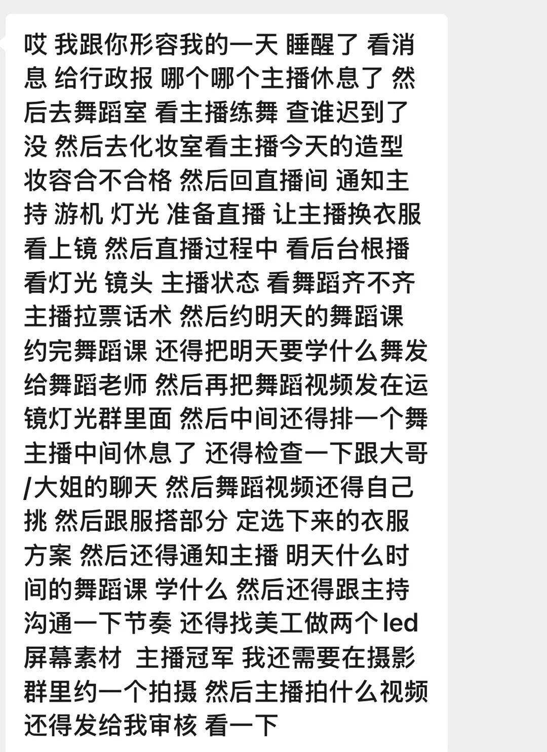 他们的工作内容包括主播的挖掘培养、上播前准备、直播中数据监控、下播后复盘、看主播和大哥大姐的聊天记录……几乎直播的所有环节他们都要把控,一天下来工作时长不比主播短。
