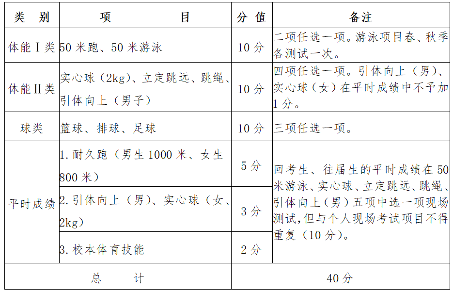 4、回考生和往届生的平时成绩采用“现场加试”的办法认定,考生可在50米游泳、实心球、立定跳远、跳绳、引体向上(男子)五个项目中任选一项作为平时成绩的加试项目参加考试,加试项目与现场考试体能Ⅰ类、体能Ⅱ类选择的项目不得重复,评分标准详见附件3。