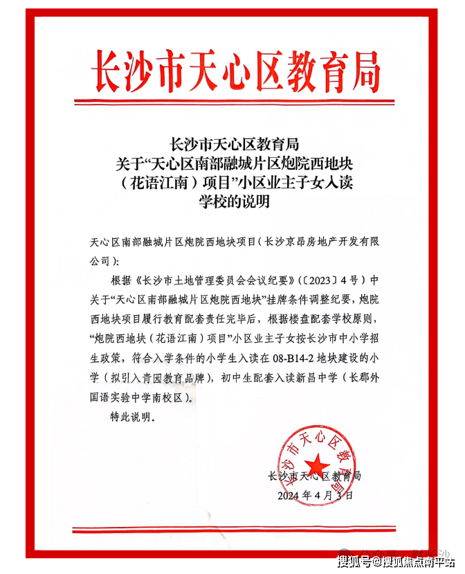 2024年4月3日,天心区教育局发布文件,明确说明花语江南业主子女可配套入读青园实验小学和长郡外国语实验中学