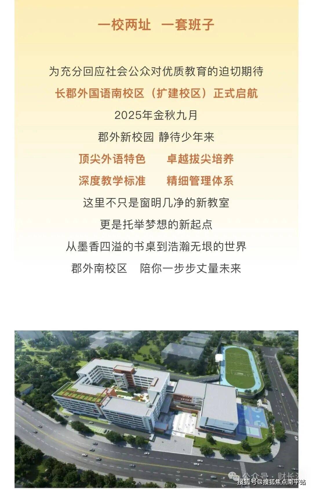 长郡外国语实验中学南校区,是天心区政府重点打造的“高起点、高标准、高品质”公办初中,与长郡外国语实验中学一脉相承,五统一原则,实行100%零差异化办学,4.35万㎡现代化数字校园,配备AI教学系统、VR实验室等,构建了全方位满足学生发展需求的学习生态。