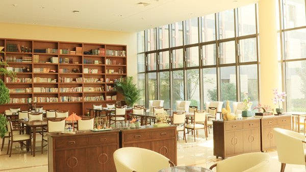 ⊤ 设施特色:高低错落建筑布局引入充足阳光与绿意,5000平米中庭绿地、屋顶花园全天开放,为长者提供休闲、观景、健身的空间。房间配备古典家具、电动升降沙发、家电及高档无障碍卫浴设施,兼顾舒适性与智能化。每层设开放厨房、起居室,配套交谊室、图书室、手工艺室、舞蹈室等多个活动场所,满足长者多元需求。