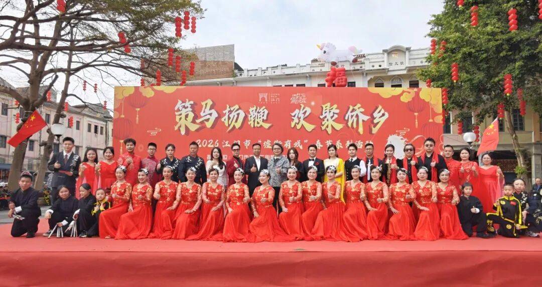 本场演出由江门市文化馆文艺志愿者艺术团及本土艺术家们倾情呈现,男女声合唱《春风十万里》中拉开演出序幕,歌声如暖流拂过骑楼,年意升腾;武术《棍武雄风》刚劲腾跃,武魂与侨骨浑然一体;流行乐《敢爱敢做》携都市脉动而来,老街瞬间沸腾;魔术《红红火火》焰彩交织,满堂祥瑞。当《到江门来》唱响,台上台下汇成热情海洋;女子群舞《锦上三月》水袖流云,青石板间舞出江南春色。女声独唱《红太阳照边疆》清亮高亢,家国记忆穿廊而过;西洋乐器演奏《天下有情人》深情婉转,《灯火里的中国》恢弘铺展,中西交融间流淌都市温情。女声独唱《爱情陷阱》粤韵金曲引全场齐和,声浪直冲骑楼天井;民乐合奏《扬鞭催马运粮忙》《步步高》奏响新春吉意、时代欢歌。男声独唱《红日》经典旋律与观众合唱交织升腾;川剧变脸瞬息更迭,国粹魅力咫尺惊心。终场,男声独唱《大喜中国年》将喜庆推向高潮——歌声悠悠,舞姿翩翩,2026江门“墟街有戏”首演在满城年味中圆满收官。