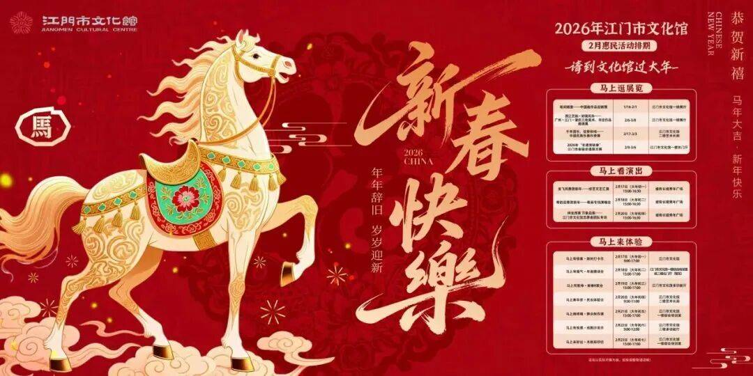 江南体育,江南体育平台,江南体育app下载,江南体育注册,足球竞彩,篮球竞猜,体育投注平台马蹄踏春归,福随瑞气来。春节,是华夏儿女心中最隆重的传统佳节,是中华文化生生不息的深情载体,更是万家灯火里最温暖的团圆坐标。马年新春,为丰富我市“请到江门过大年”优质文旅产品供给,满足广大市民、游客欢度佳节的美好需求,江门市文化馆以“粤新年·请到文化馆过大年”为主题,精心策划系列文化惠民活动,唤醒记忆深处的年味,点亮侨都新春的流光。我们诚邀四海宾朋走进文化馆,在传统与现代交融的年节图景中,品味文化温度,共度良辰好景——这个春节,邀您“马”上来打卡,一站式畅游“江门三点三精彩之旅”,共赴一场有底蕴、有温情、有侨味的文化年。