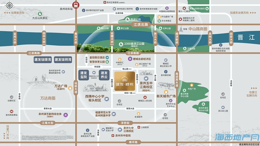 ①占位鲤城江南金鲤大道旁,直通金鲤大桥(规划,连接老城区),旁边拥西隅中心小学坂头校区、泉州五中江南校区(规划中)、鲤城总部经济区、鲤城万达广场(在建)等繁盛资源。