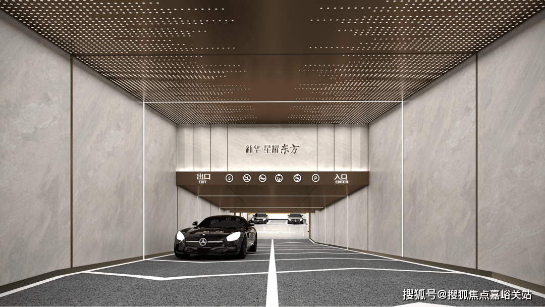 (5)人车分流 星空车顶入口对行人、机动车进行优化分流,保障业主安全;而地面停车位,方便参观者、业主等临时停车的需求。另外在车库上,项目还打破了常规地库的单调、晦暗。直接将豪车专属的星空顶搬入了地库里。从车行驶入地库的那一刻开始,一场名为“宏大”的归家之旅就开始了。通道入口,顶部优雅的星空放射灯,展现出浩瀚星空般的深邃、璀璨,搭配两侧的高级铺面材质,尽显奢华气质。