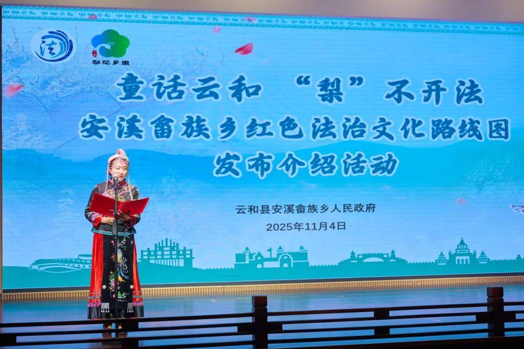 晚会现场发布了云和县安溪畲族乡红色法治文化路线个核心体验点位,将法治文化与当地特色深度融合。路线图既串联红色历史印记,让观众重温革命先烈的初心坚守,又融入雪梨产业发展,展现乡村振兴中的法治护航,还嵌入畲族民俗风情,让民族文化与法治精神碰撞融合,构成一次可感、可学、可体验的完整红色法治文化体验。